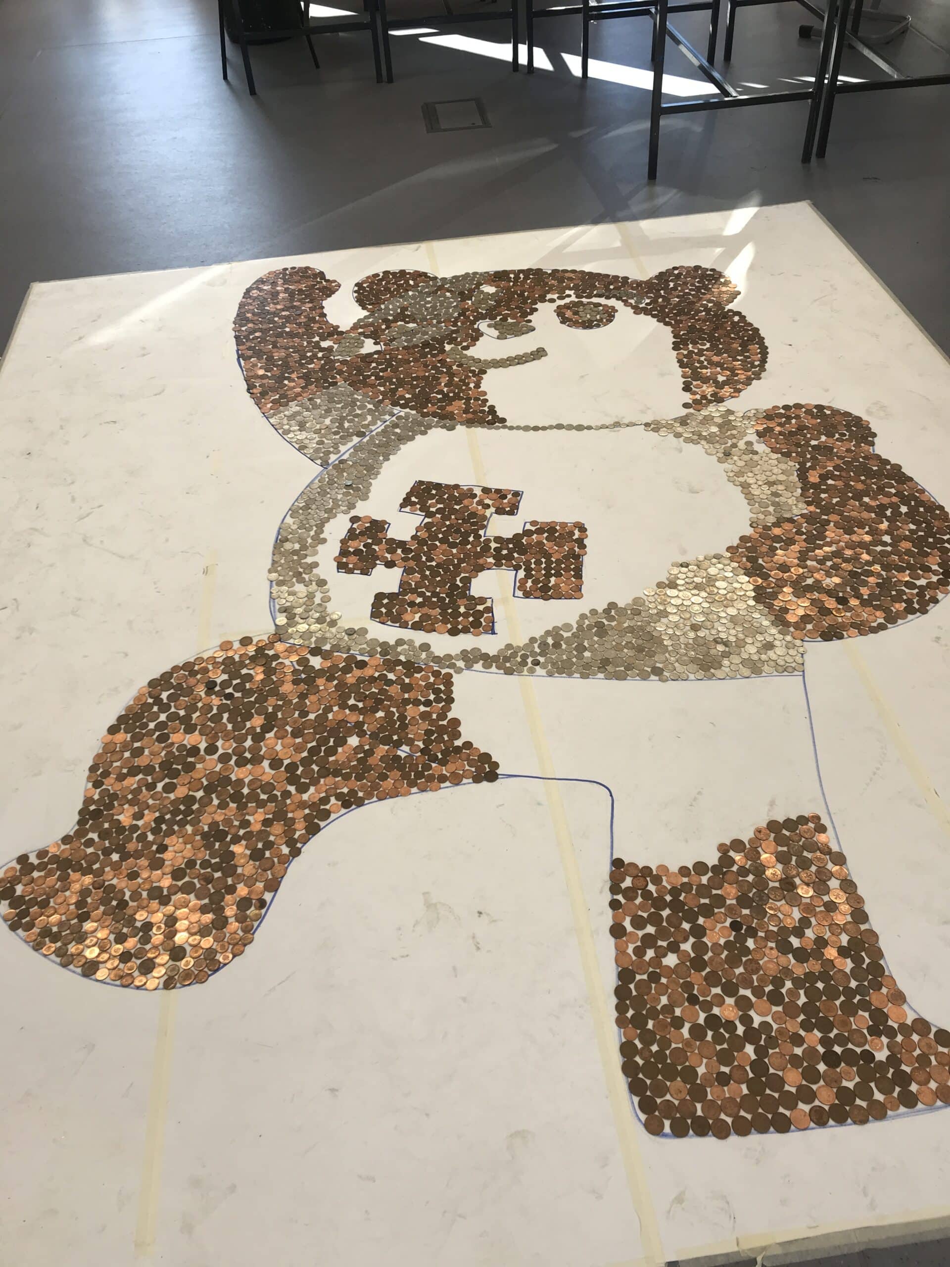 Pupils from each year group have taken turns throughout the day to take bags of coins, in varying colours, sizes and value, which they have been placing within the picture of Pudsey.
