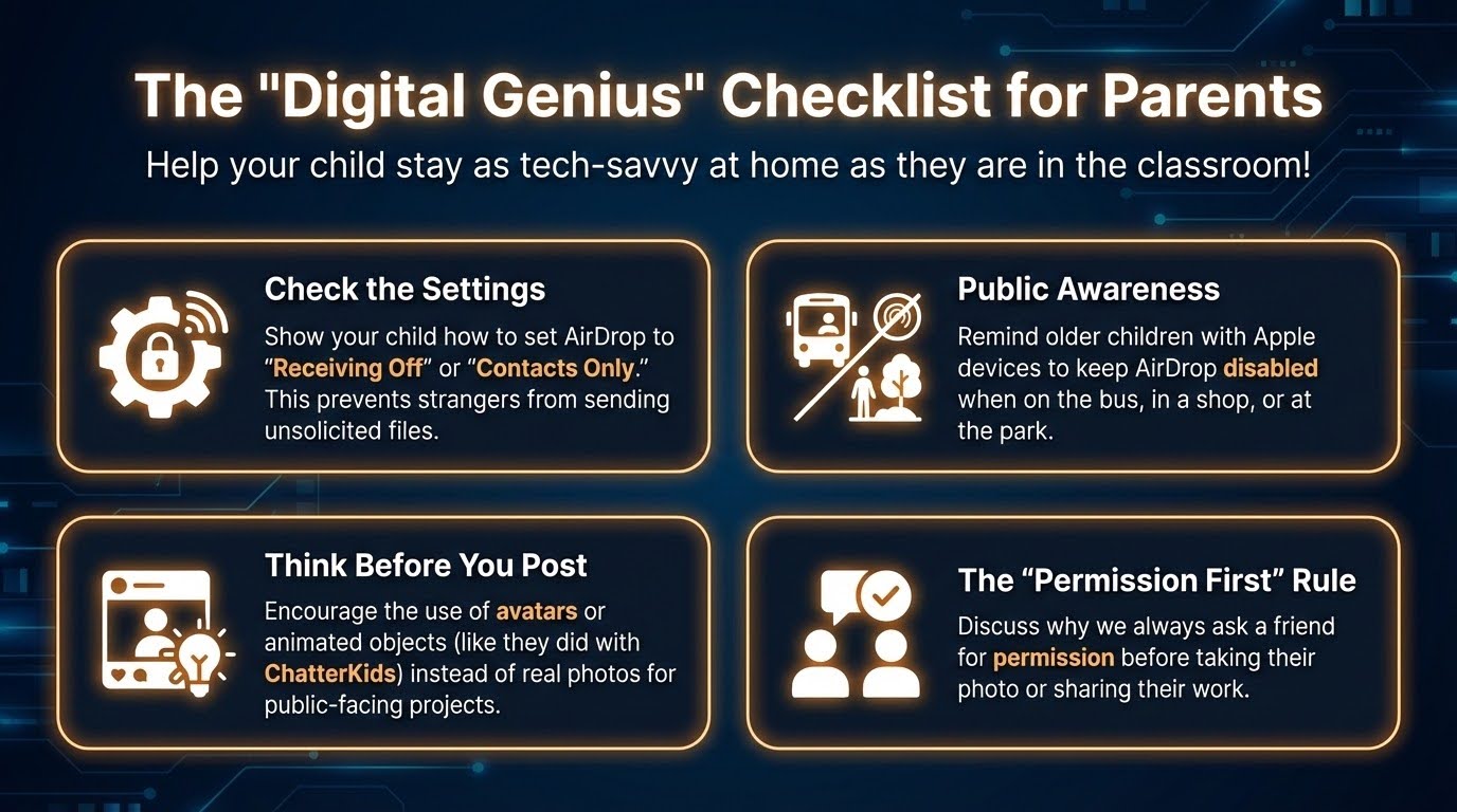 A key focus of this project was digital privacy. The pupils learned why we avoid using images of ourselves or others when publishing content online. They also explored the power of AirDrop to share work between devices efficiently. Importantly, we discussed “digital boundaries” — learning to keep AirDrop disabled when not in use, especially when using personal devices in public places. See below for some helpful tips that parents can share with their children.
