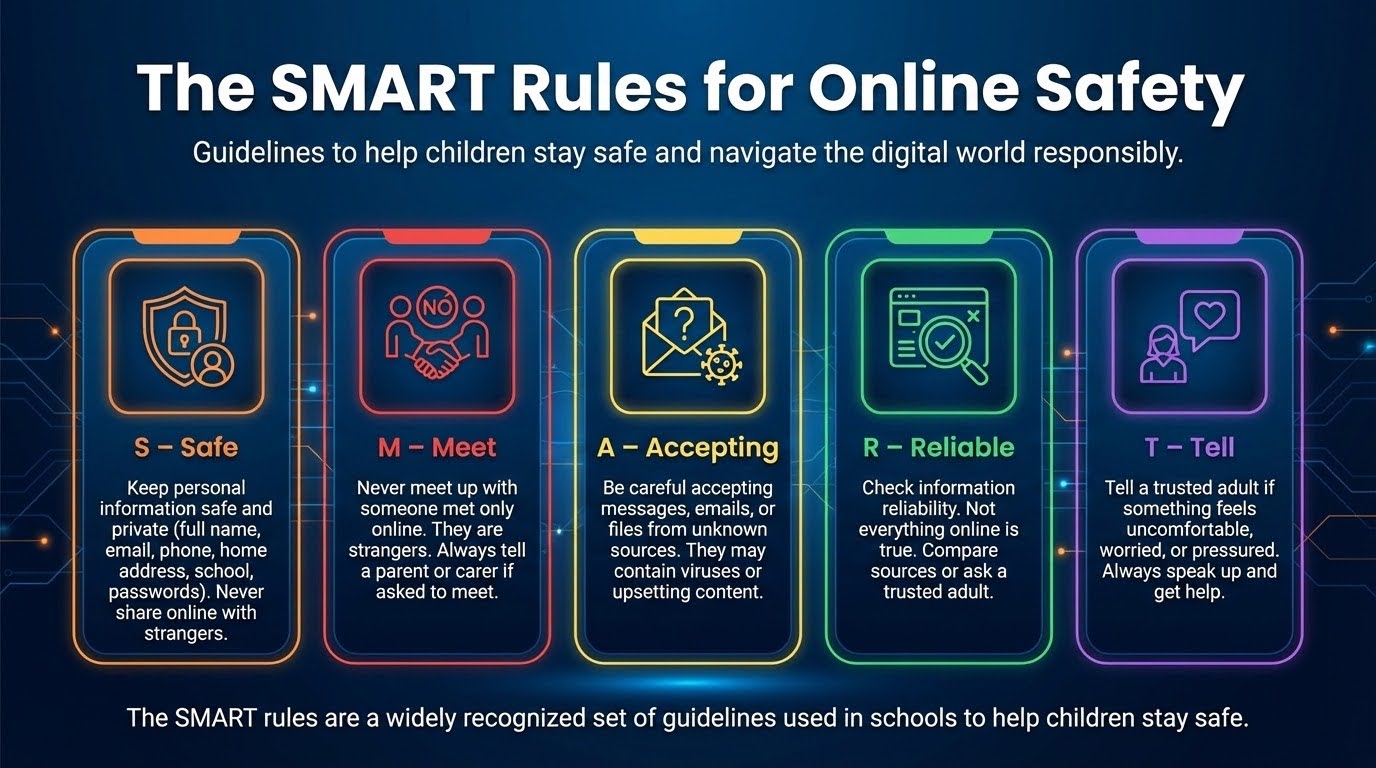 The students began their journey by working in collaborative teams to design ebooks with a specific audience in mind. Their first major project involved creating E-Safety SMART Rules books, thoughtfully designed to help our younger pupils navigate the digital world safely and responsibly.